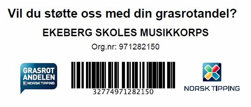 Vi oppfordrer deg til å gi din Grasrotandel til Ekeberg skoles musikkorps! Da støtter du et godt organisert arbeid for barn og ungdom – de får instrumenter, instruksjon og lærer å mestre samspill både musikalsk og sosialt. Og det blir musikk og trivelige arrangementer i nærmiljøet!
